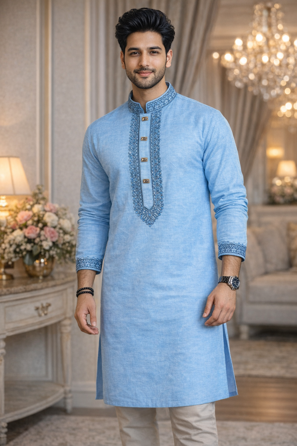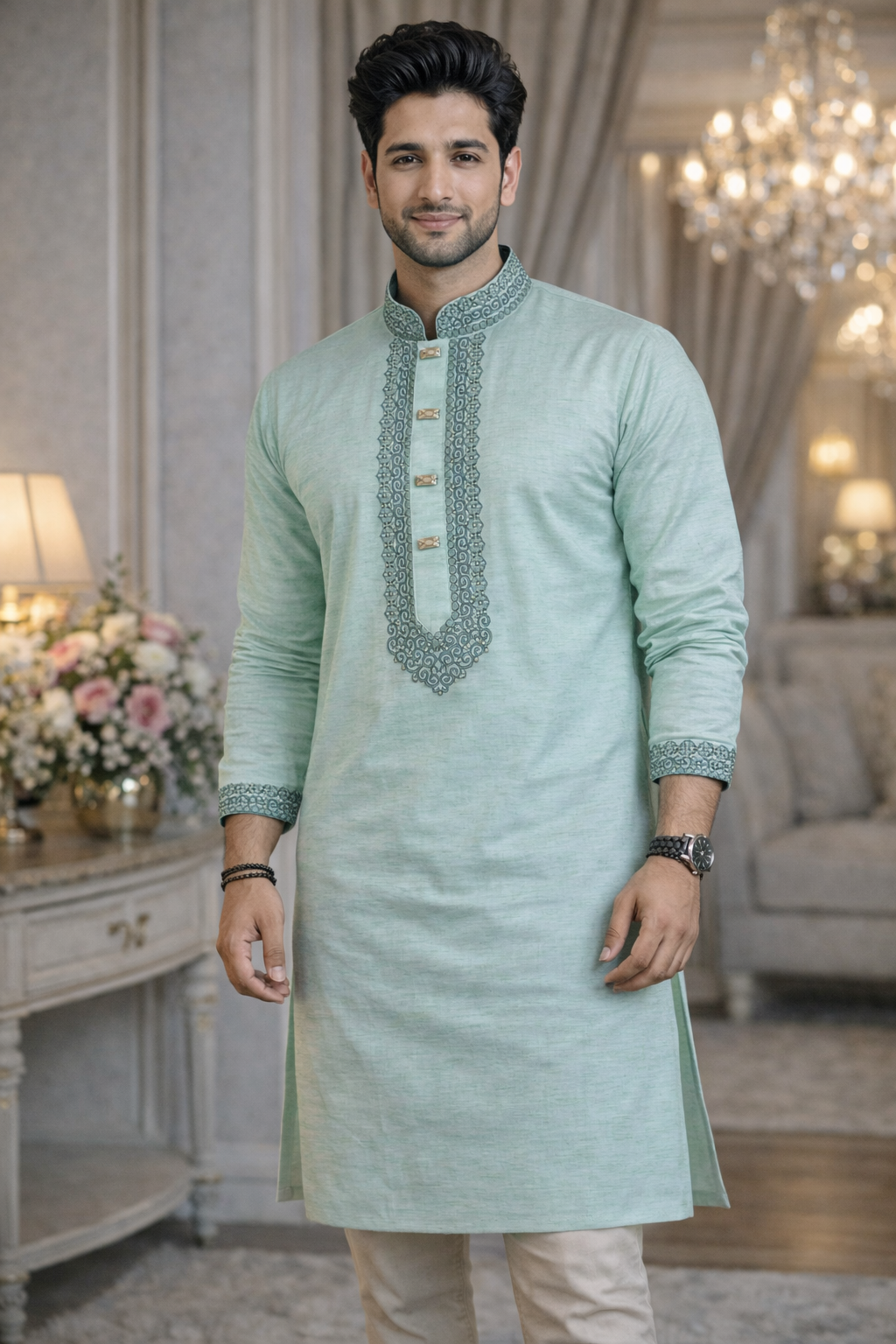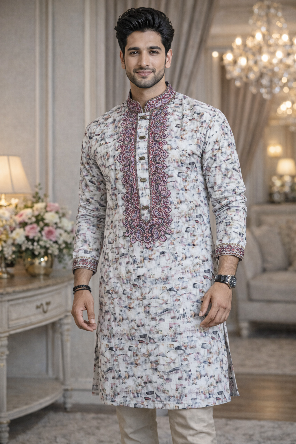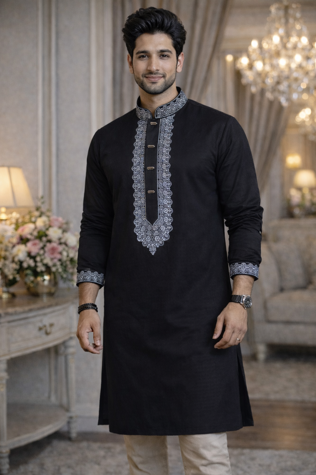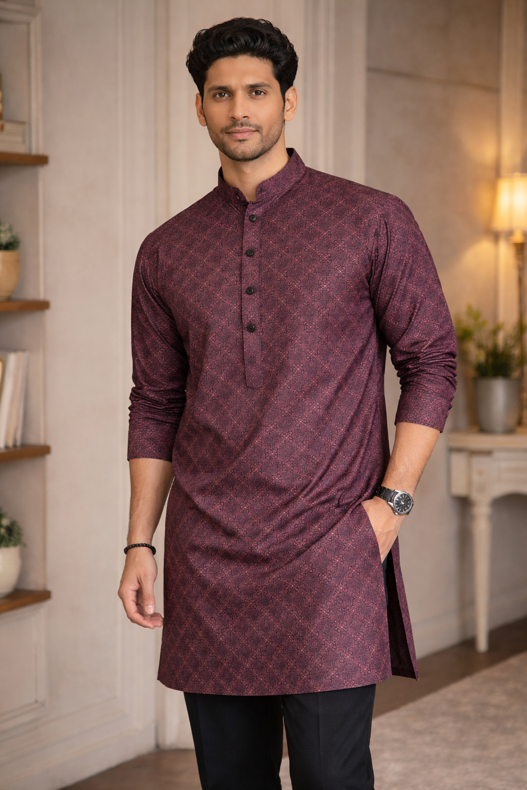 কাপড়: এগুলো প্রিমিয়াম সলিড কটন বা লিনেন টেক্সচার্ড কাপড় দিয়ে তৈরি, যা দেখতে যেমন রাজকীয় তেমনি গরমে পরার জন্য বেশ আরামদায়ক।