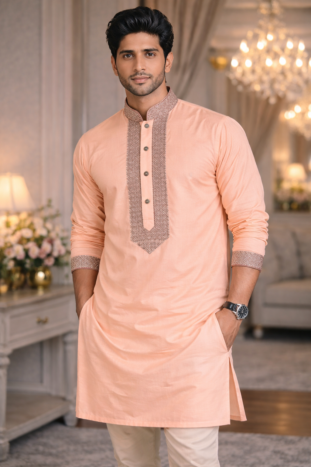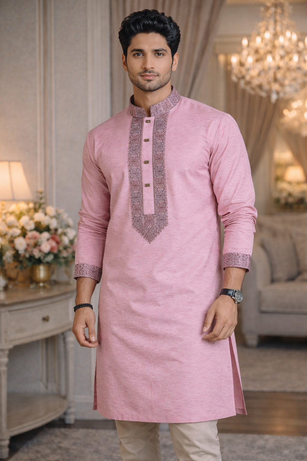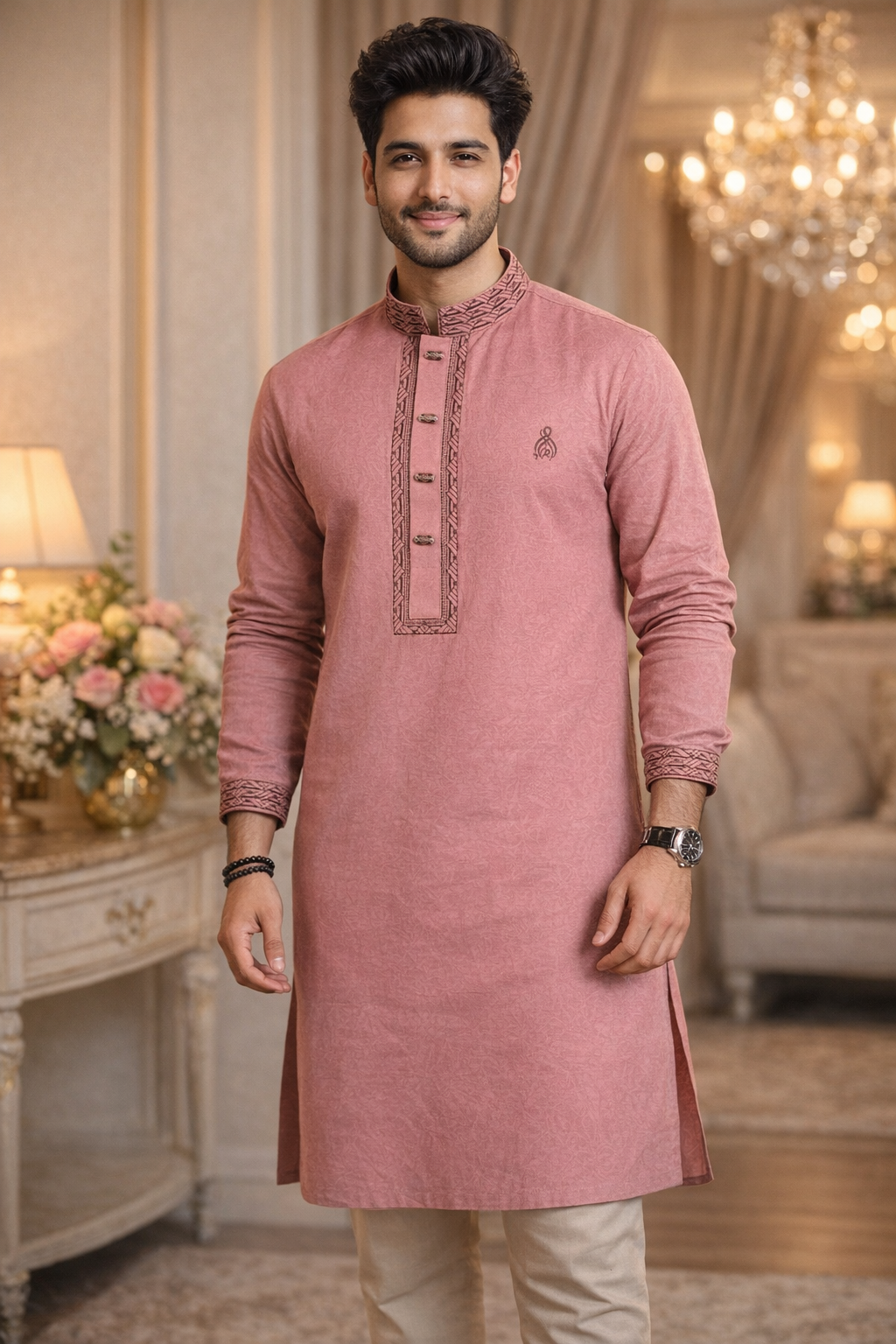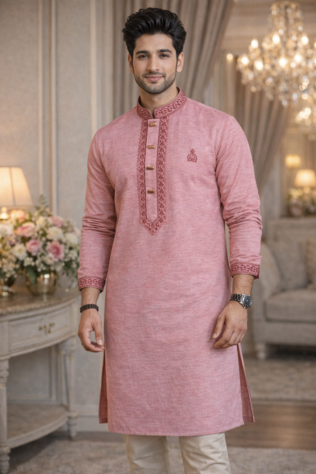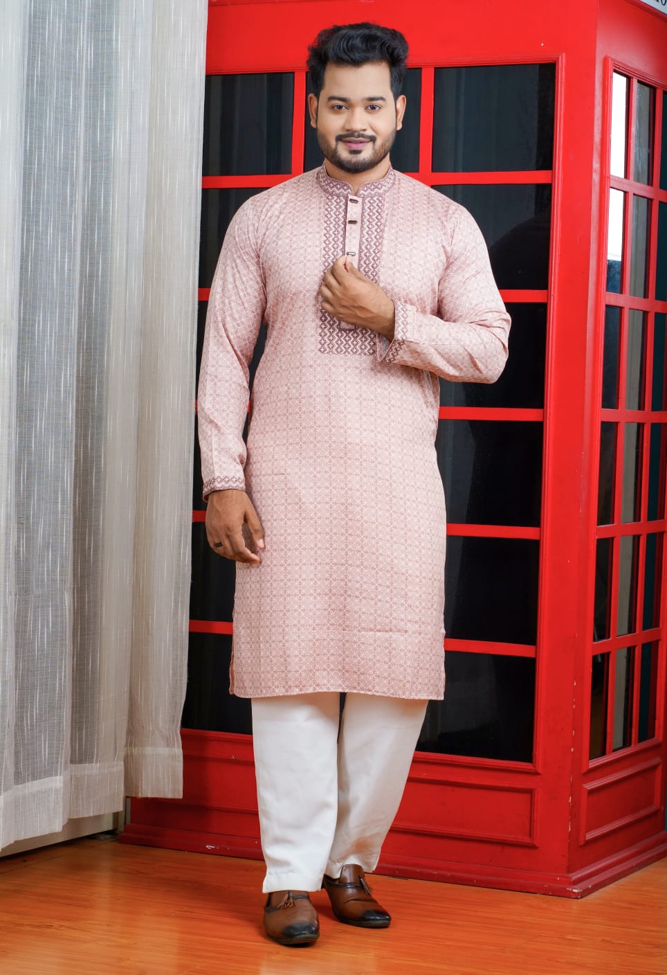 রঙ: পাঞ্জাবিটি অত্যন্ত মার্জিত ও আধুনিক ডাস্টি রোজ বা পিচ কালারের।