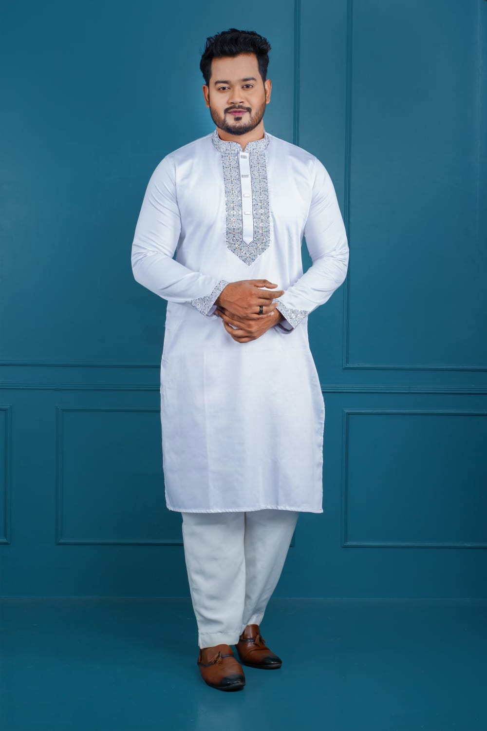 কাজ (এমব্রয়ডারি): পাঞ্জাবিগুলোর কলার এবং বুকের প্লেকেটে নিখুঁত এমব্রয়ডারি ও কারচুপির কাজ করা হয়েছে। অনেকগুলোতে গর্জিয়াস লুক দিতে উজ্জ্বল সিকুইন বা চুমকি ব্যবহার করা হয়েছে।