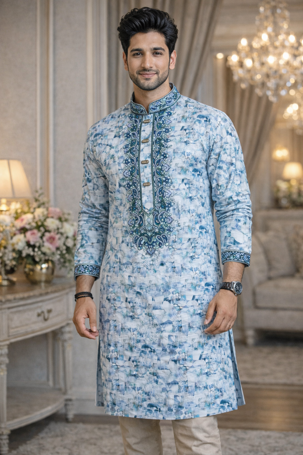ডিজাইন ও হাতা: বুকের কাজের সাথে সামঞ্জস্য রেখে হাতার কাফেও (Cuff) এমব্রয়ডারি ডিজাইন করা হয়েছে এবং কিছু মডেলে ডিজিটাল প্রিন্টের ব্যবহারও দেখা যায়।